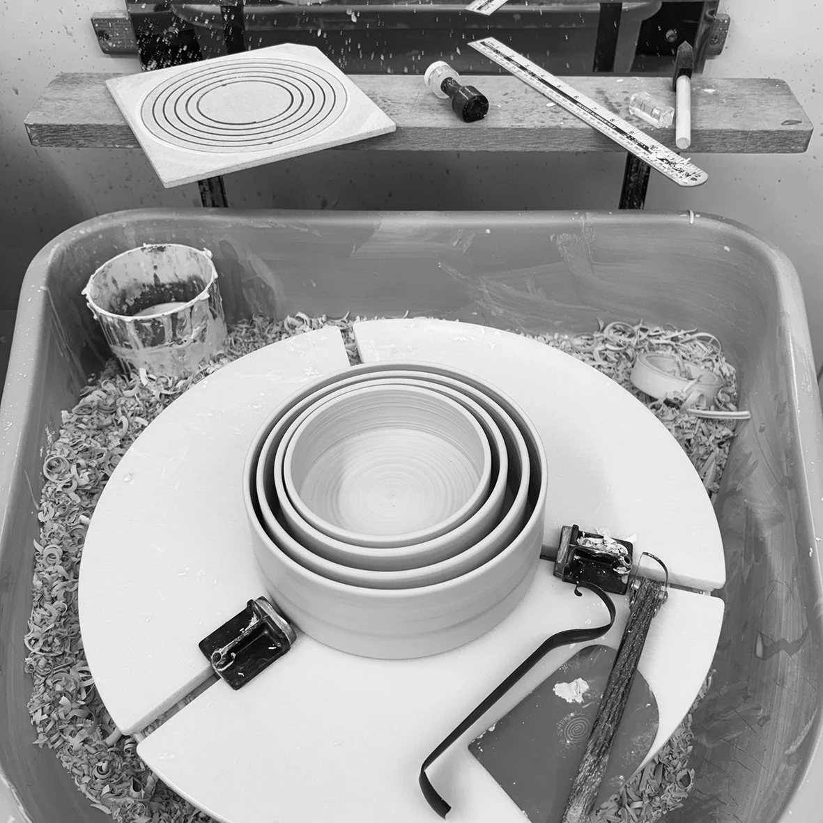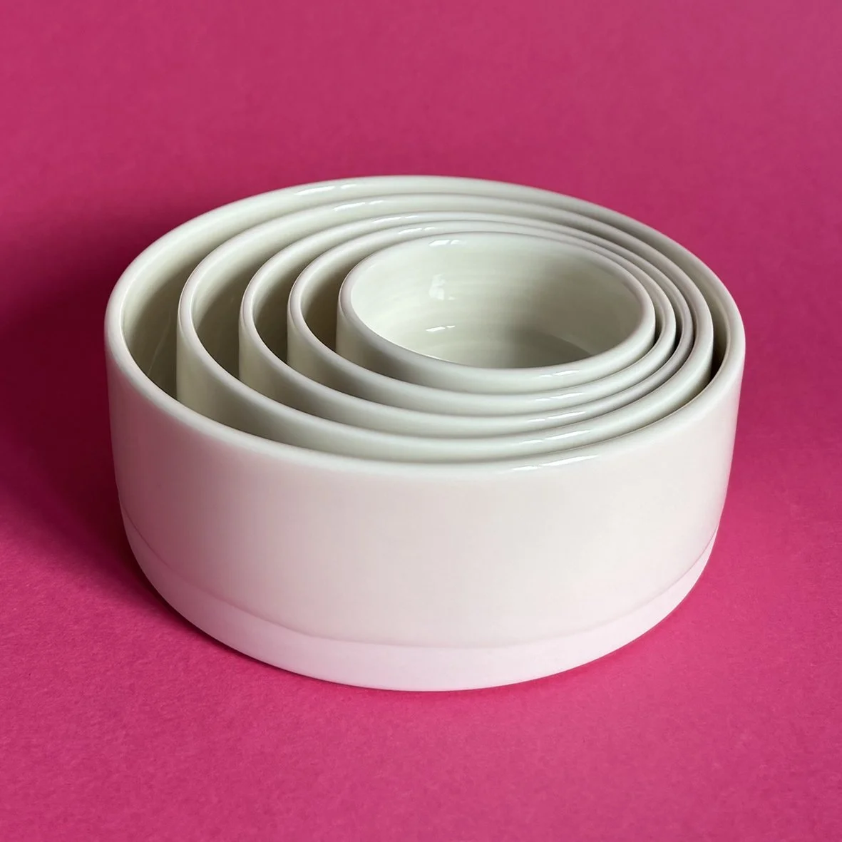 I throw with porcelain as I love the purity of the clay. Once partially dried the pieces are trimmed to refine the forms. Glazes are limited to clear or white (glossy or satin matt) and exteriors are often left unglazed, so the colour and tactile quality of the clay can be enjoyed.